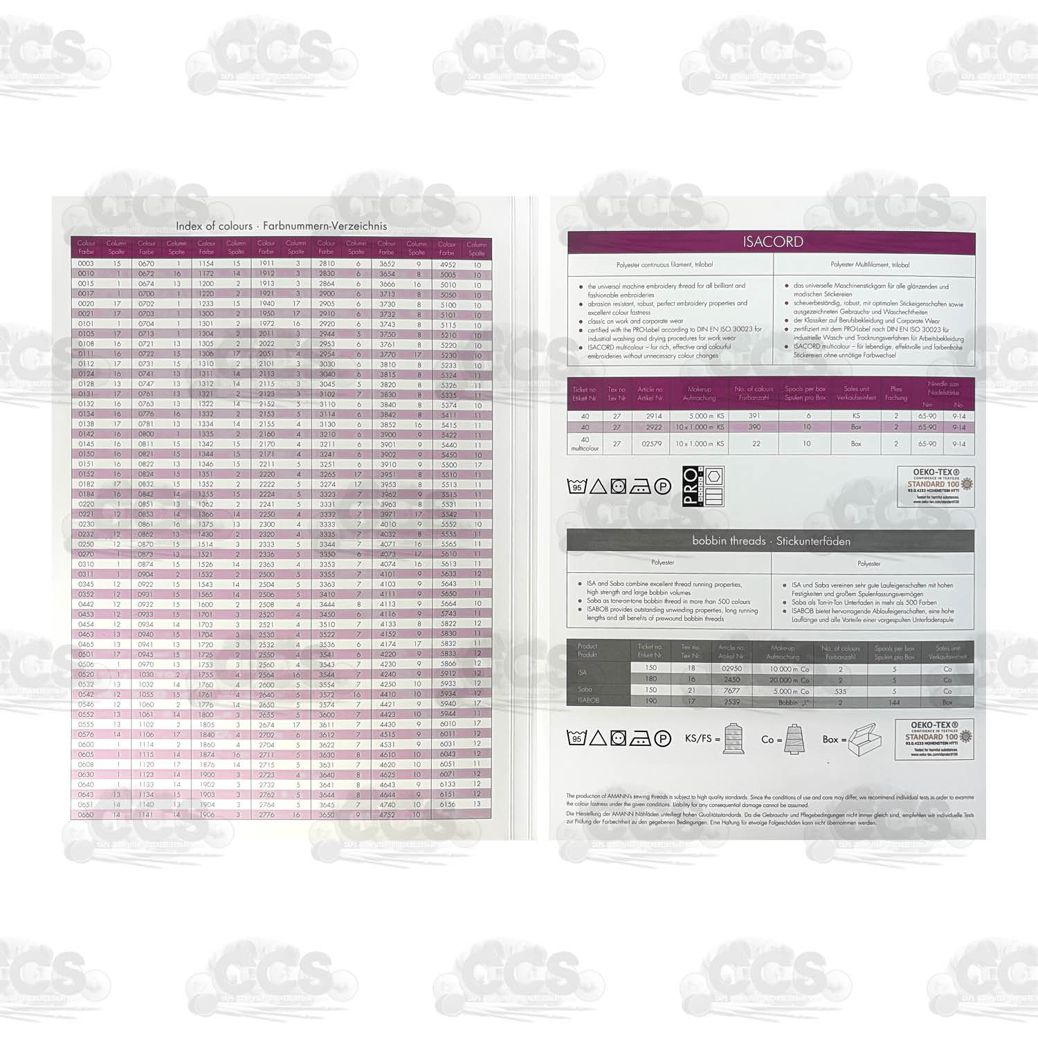 Diese Farbkarte enthält Garn-Abschnitte von 390 Isacord- und 22 Multicolor-Farben der Firma Amann, sowie eine Tabelle der Garne, angeordnet nach den Farbnummern damit Sie diese schneller finden können und außerdem zusätzliche Informationen zur Garnqualität und Anwendungsgebieten der Garne. Anhand dieser Farbkarte sehen Sie die Farben, so wie sie in Wirklichkeit aussehen, anders als dies bei fotografierten Farben der Fall ist.