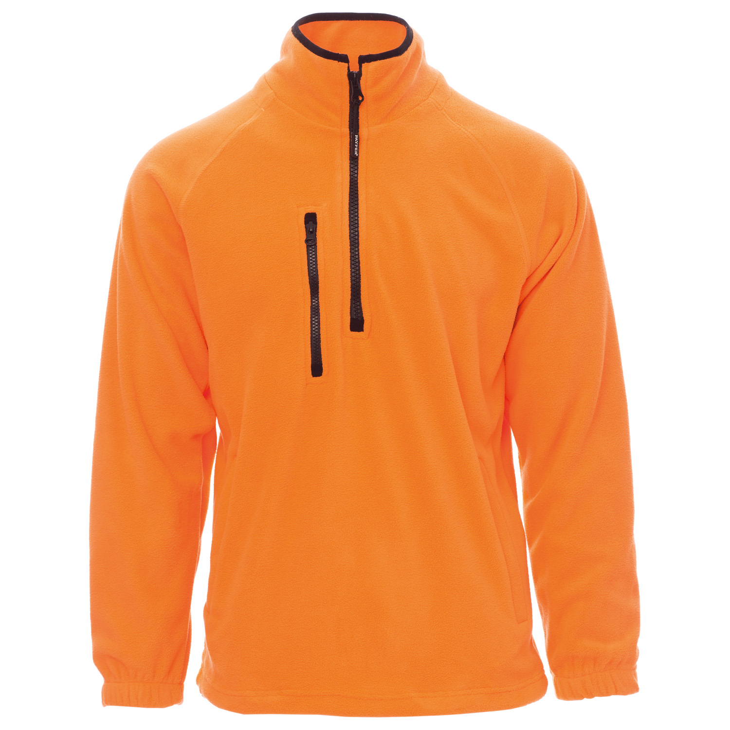 Fleecepullover mit kurzem, schwarzem 8 mm Reißverschluss aus Kunststoff, Raglanärmeln, regulierbarem Kordelzug in der Taille, elastischen Ärmelbündchen, zwei Taschen mit verdecktem Reißverschluss, einer Vordertasche mit Reißverschluss, Kragen mit verstärktem Rand in Kontrastfarbe, verstärkten Nähten.