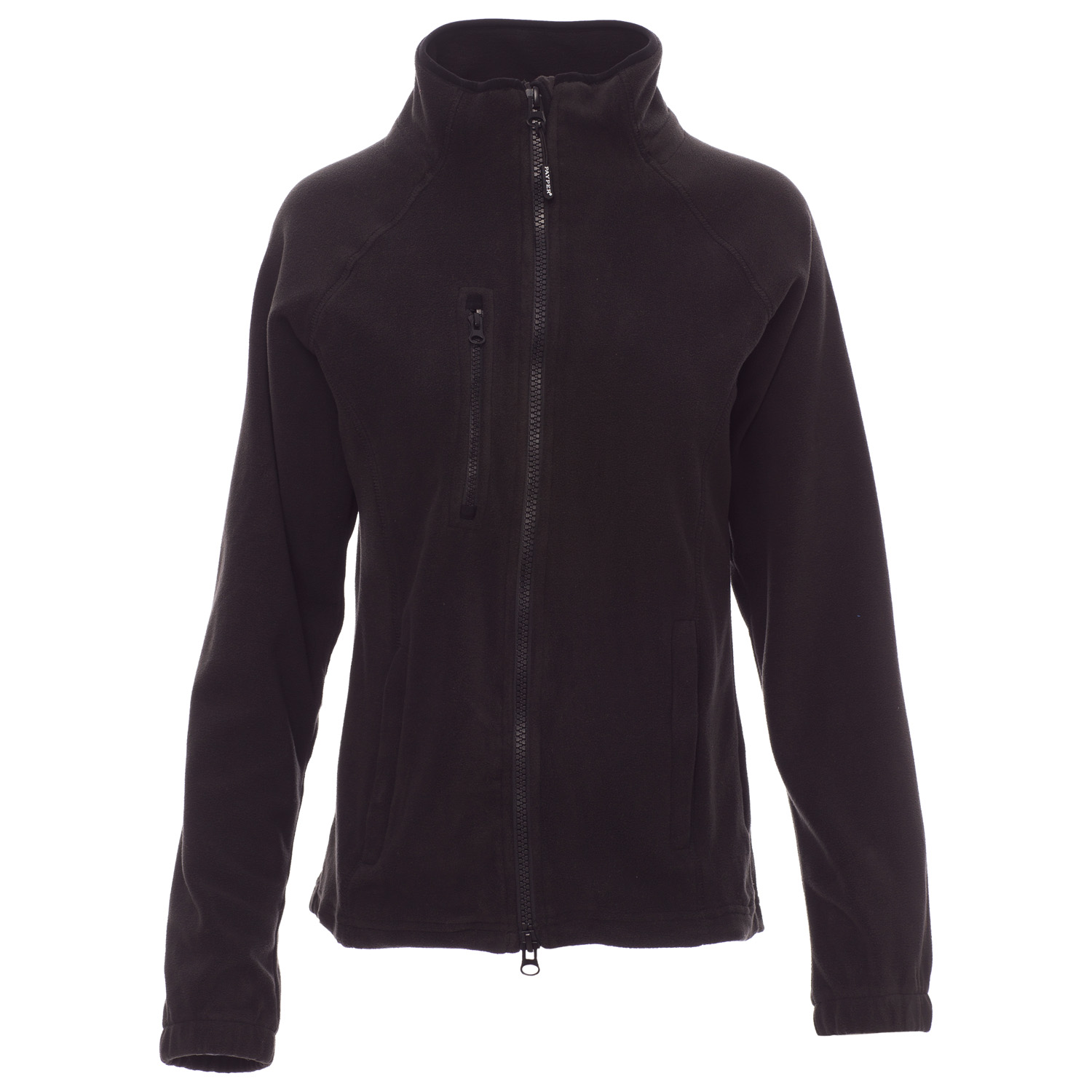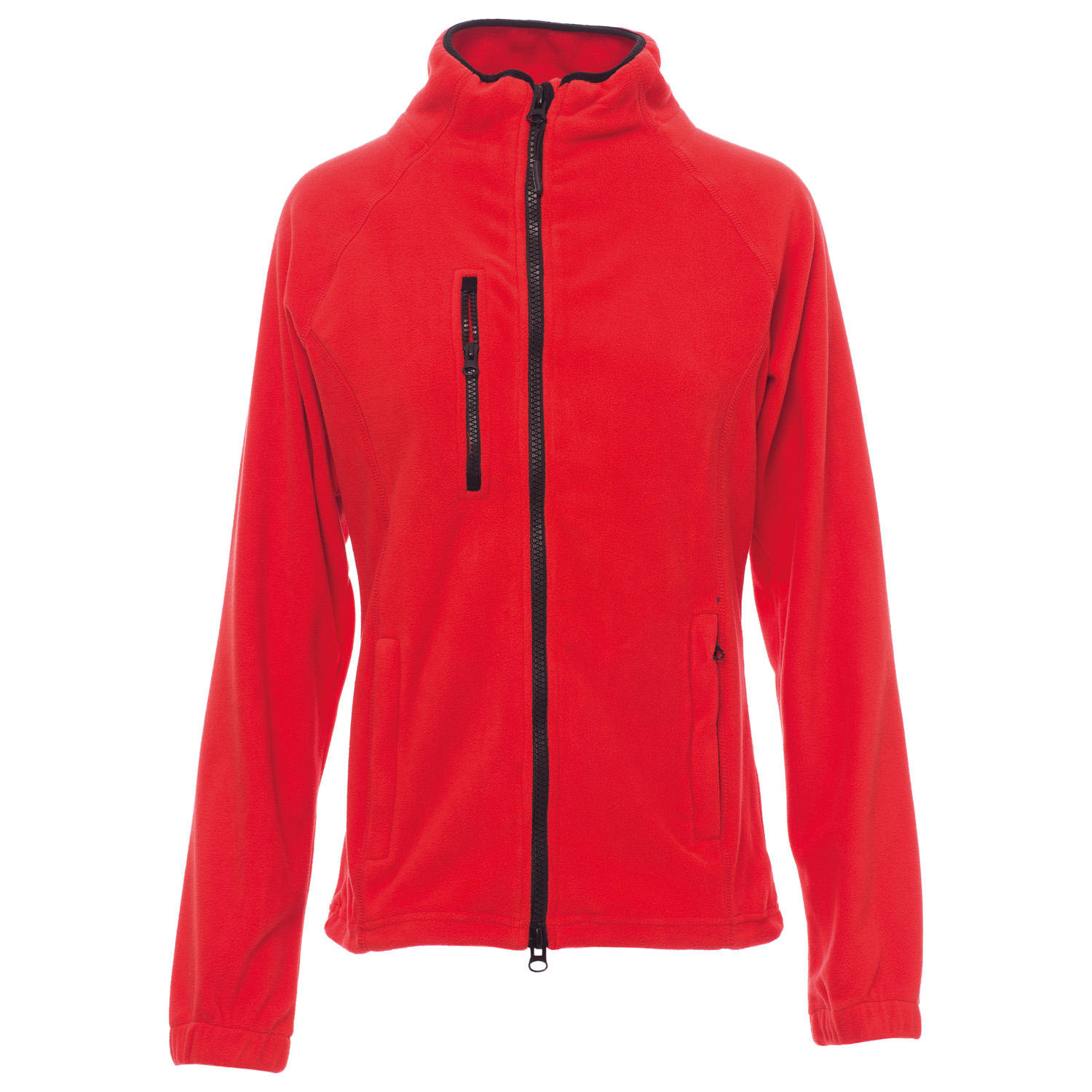 Taillierte Damen-Fleecejacke mit durchgehendem, schwarzem 8 mm Reißverschluss aus Kunststoff, Raglanärmeln, regulierbarem Kordelzug in der Taille, elastischen Ärmelbündchen, zwei Taschen mit verdecktem Reißverschluss, einer Vordertasche mit Reißverschluss, Kragen mit verstärktem Rand in Kontrastfarbe, verstärkten Nähten.