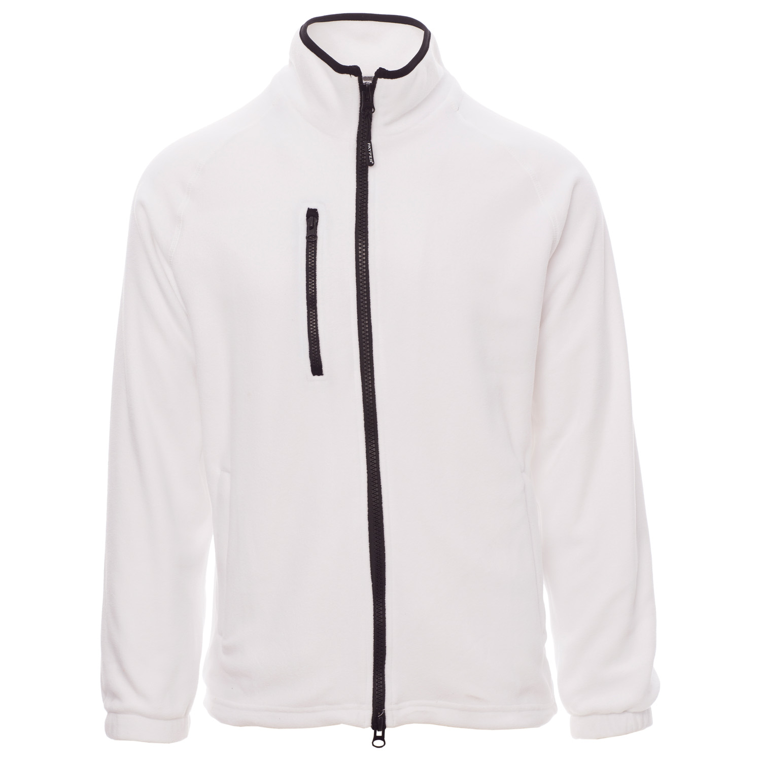 Herren-Fleecejacke mit durchgehendem, schwarzem 8 mm Reißverschluss aus Kunststoff, Raglanärmeln, regulierbarem Kordelzug in der Taille, elastischen Ärmelbündchen, zwei Taschen mit verdecktem Reißverschluss, einer Vordertasche mit Reißverschluss, Kragen mit verstärktem Rand in Kontrastfarbe, verstärkten Nähten.