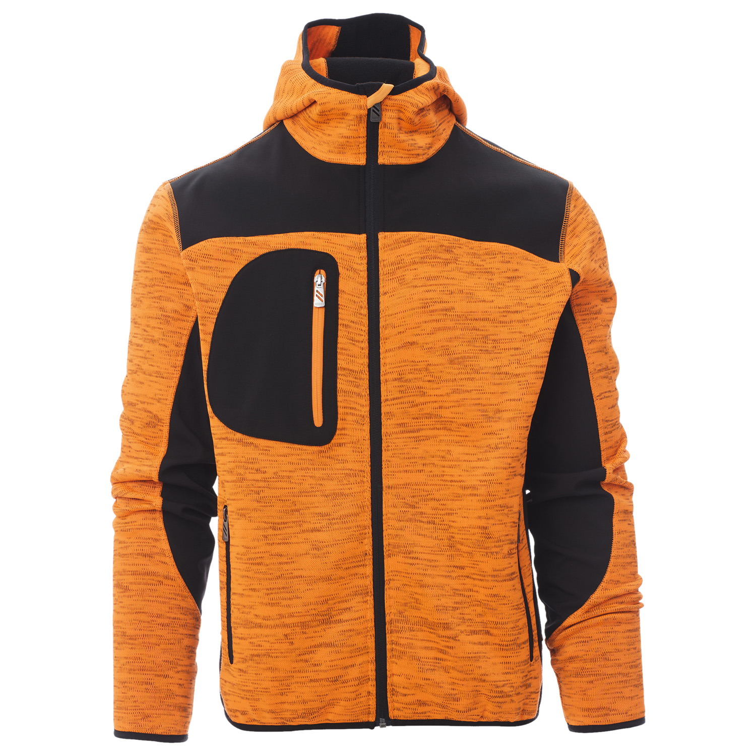 Taillierte Herren-Jacke mit langem versiegeltem SBS-Reißverschluss, vorgeformter Kapuze mit zwei Nähten, feinem Saum an Handgelenk und Taille, zwei Seitentaschen mit Reißverschluss, einer Brusttasche und schwarzen Strick- und Softshell-Einsätzen.