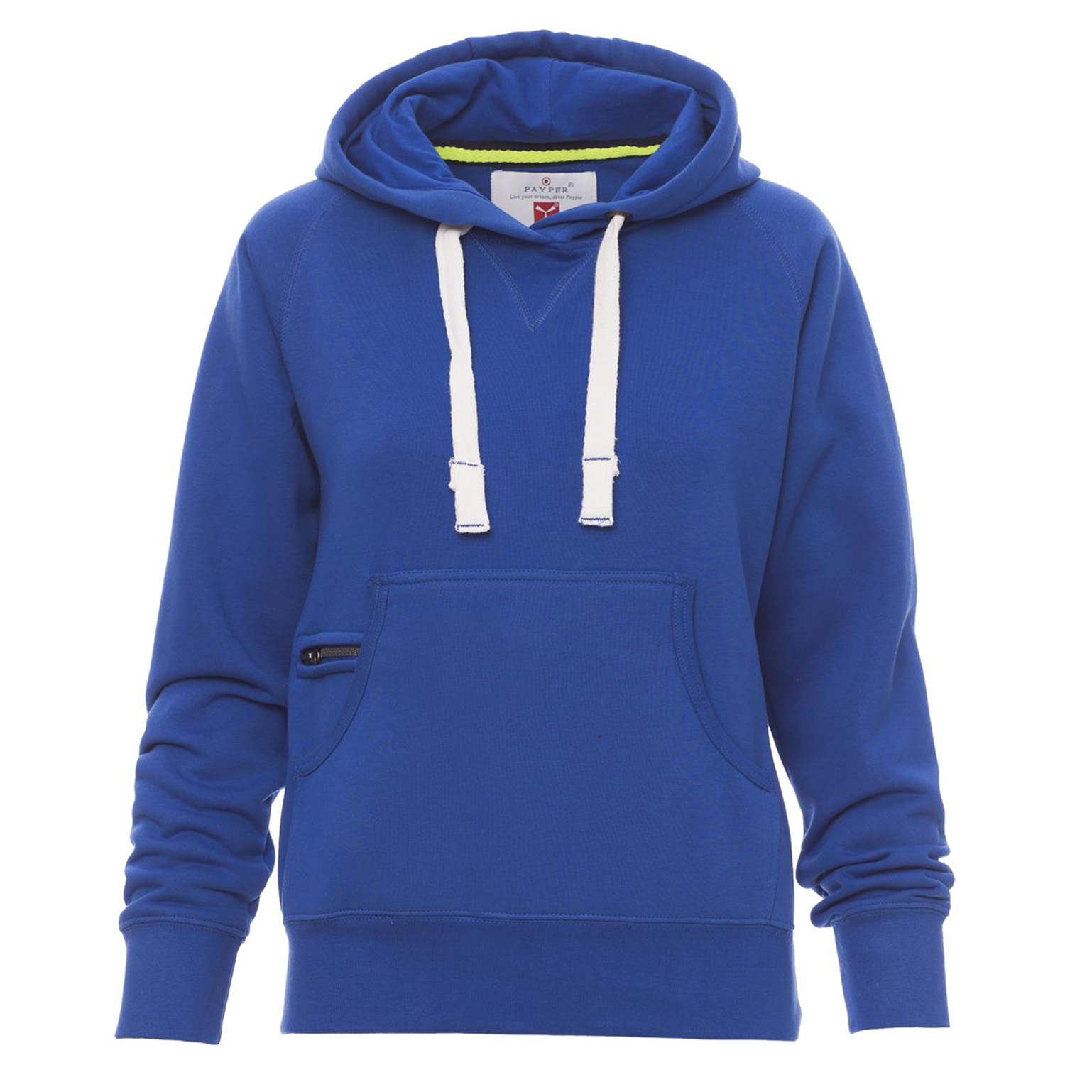 Tailliertes Damen-Sweatshirt mit Kapuze mit zwei Nähten und weißem Kordelzug, Nähten Ton-in-Ton und Metallösen, Raglanärmeln, V-Ziernaht am Ausschnitt, Kängurutaschen, Reißverschlusstäschchen, elastischem Feinripp an Ärmeln und Taille, verstärkten Nähten.