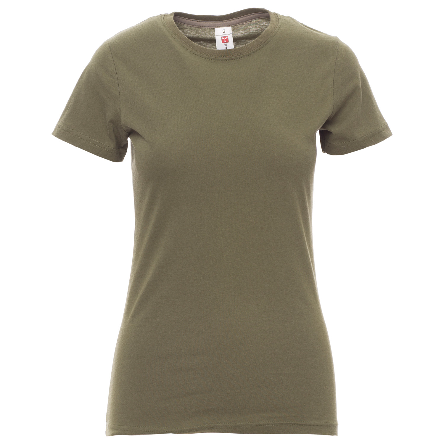Tailliertes Damen-T-Shirt mit Rundhalsausschnitt, kurzärmelig, Feinripp-Kragen 1,5 cm aus Spandex-Mischgewebe mit Kappnaht an der Vorderseite, Verstärkungsband in Kontrastfarbe von Schulter zu Schulter, das im Kragen sichtbar ist, Stretchnähten, Seitennaht.