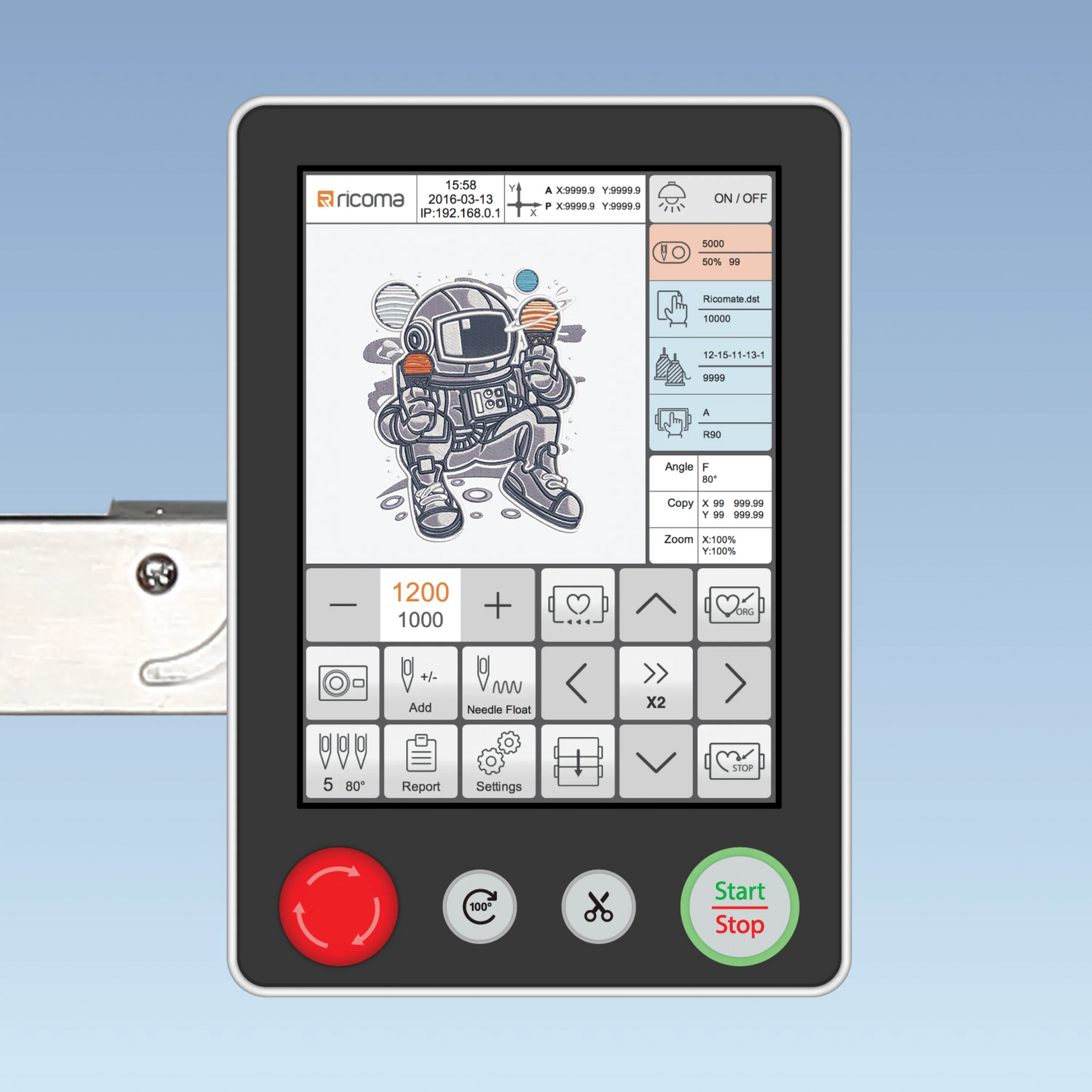 - Das Hauptbedienfeld ist auf der rechten Seite der Stickmaschine, und damit ideal zu erreichen