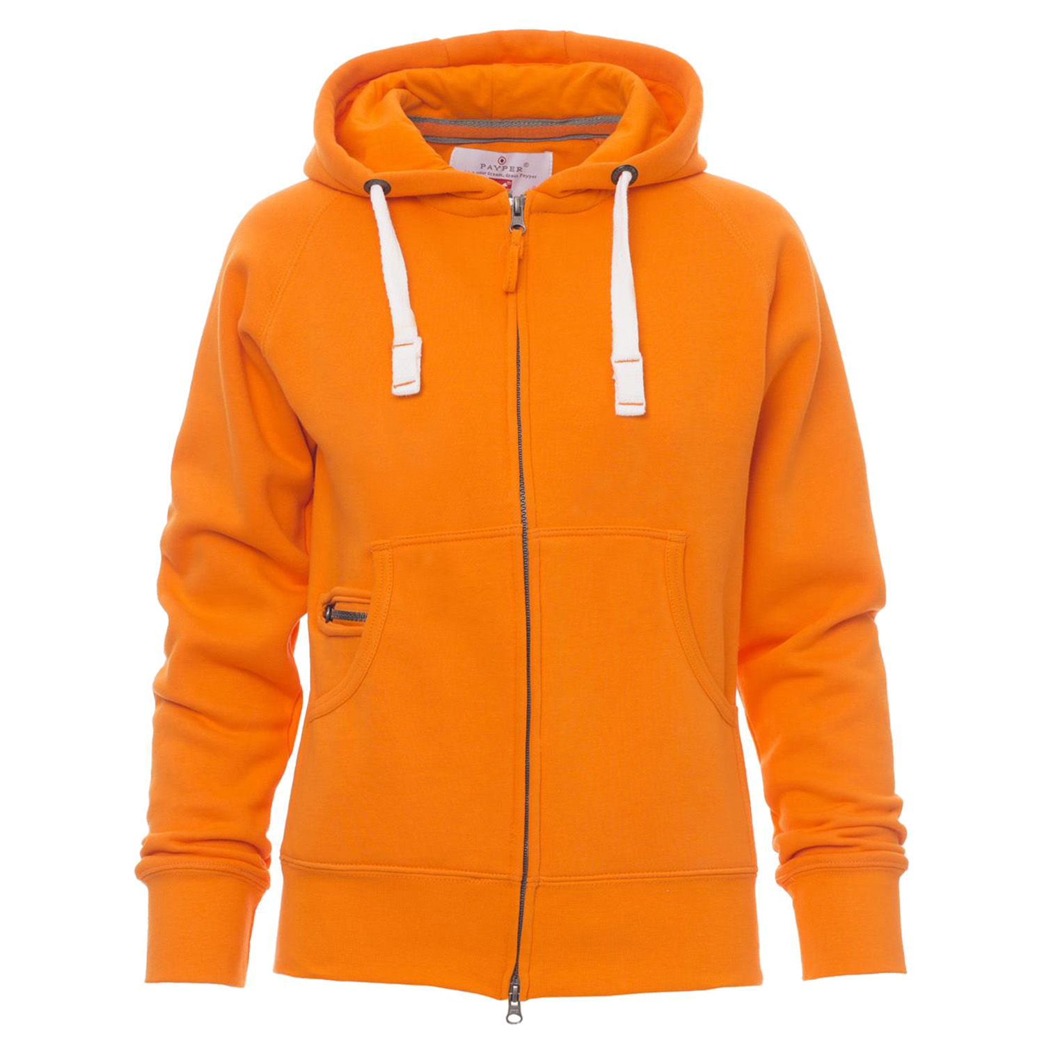 Women’s fitted sweat jacket with full, plastic-covered SBS zip with double metal pull, hood with double stitched seams and white drawstring with contrasting stitching and metal rings, raglan sleeves, kangaroo pockets, small zip pocket, stretch rib cuffs and hem, reinforced seams.